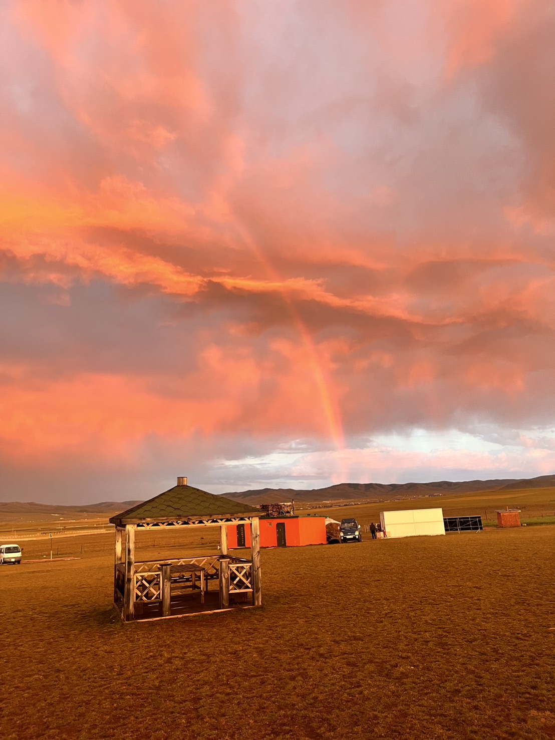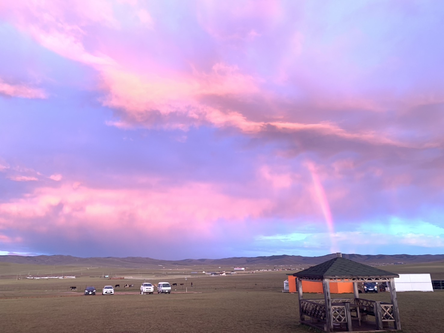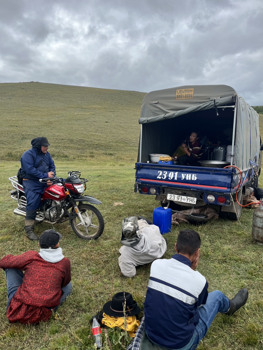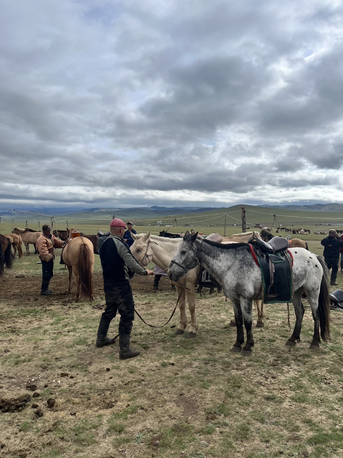 休憩を終えてラストスパート! ところが空模様が怪しくなり、遠くで雷が光り始めます。雷雲に向かって馬を走らせる私たちの姿は、どこか映画のワンシーンのようで勇ましく感じられました。ようやくゲルに到着した途端、雨が降り出し間一髪でセーフ。装備を片付けていると、今度は屋根を激しく叩く音が。外を見ると雹が降っており、後から到着した別のツアー参加者が大変そうにしていました。数十分後、空は一転して青空に。モンゴルの「一日に四季がある」と言われる所以を実感しました。
