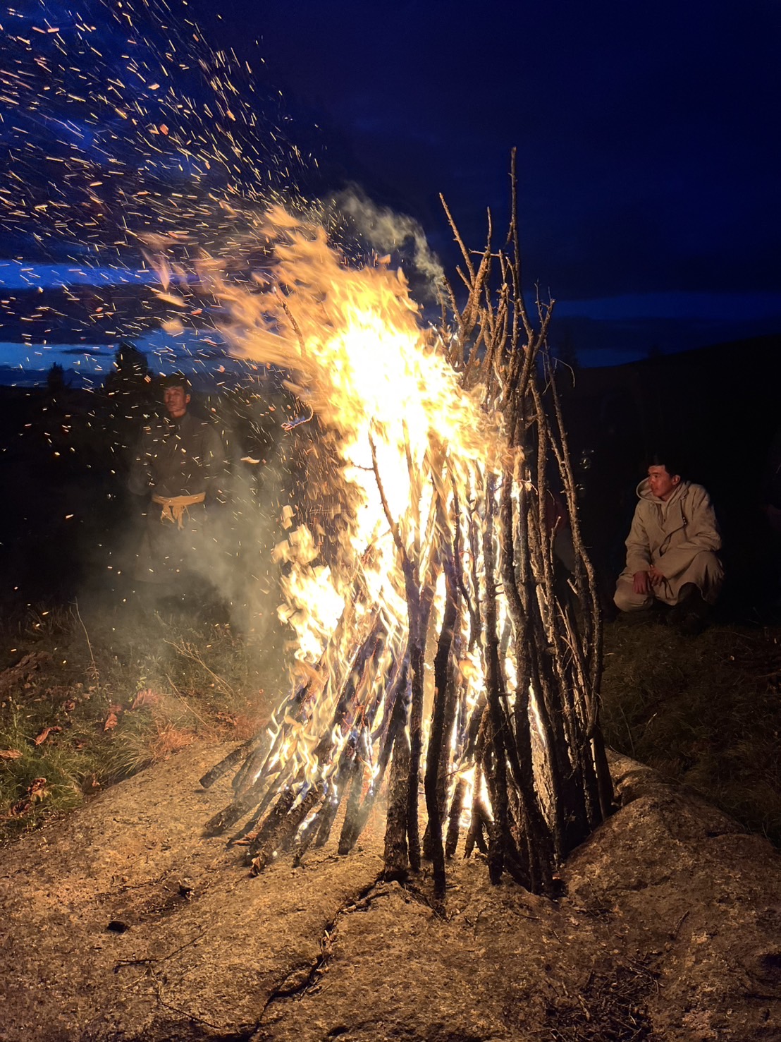 到着すると、すでにスタッフがテントを設営してくれており、自分の荷物を運び入れて一息。夕食は羊肉と野菜の雑炊で、冷え込んだ体に温かさが沁み渡りました。食後は皆で枯れ木を集め、焚き火の準備。火が灯ると冷たい草原の空気が和らぎ、炎の揺らめきに心が穏やかになります。見上げれば、そこには息をのむほどの満天の星空。この瞬間だけでも、モンゴルに来た価値があったと実感しました。焚き火を囲んでガイドや遊牧民、ツアー仲間と語らい、忘れられない一夜となりました