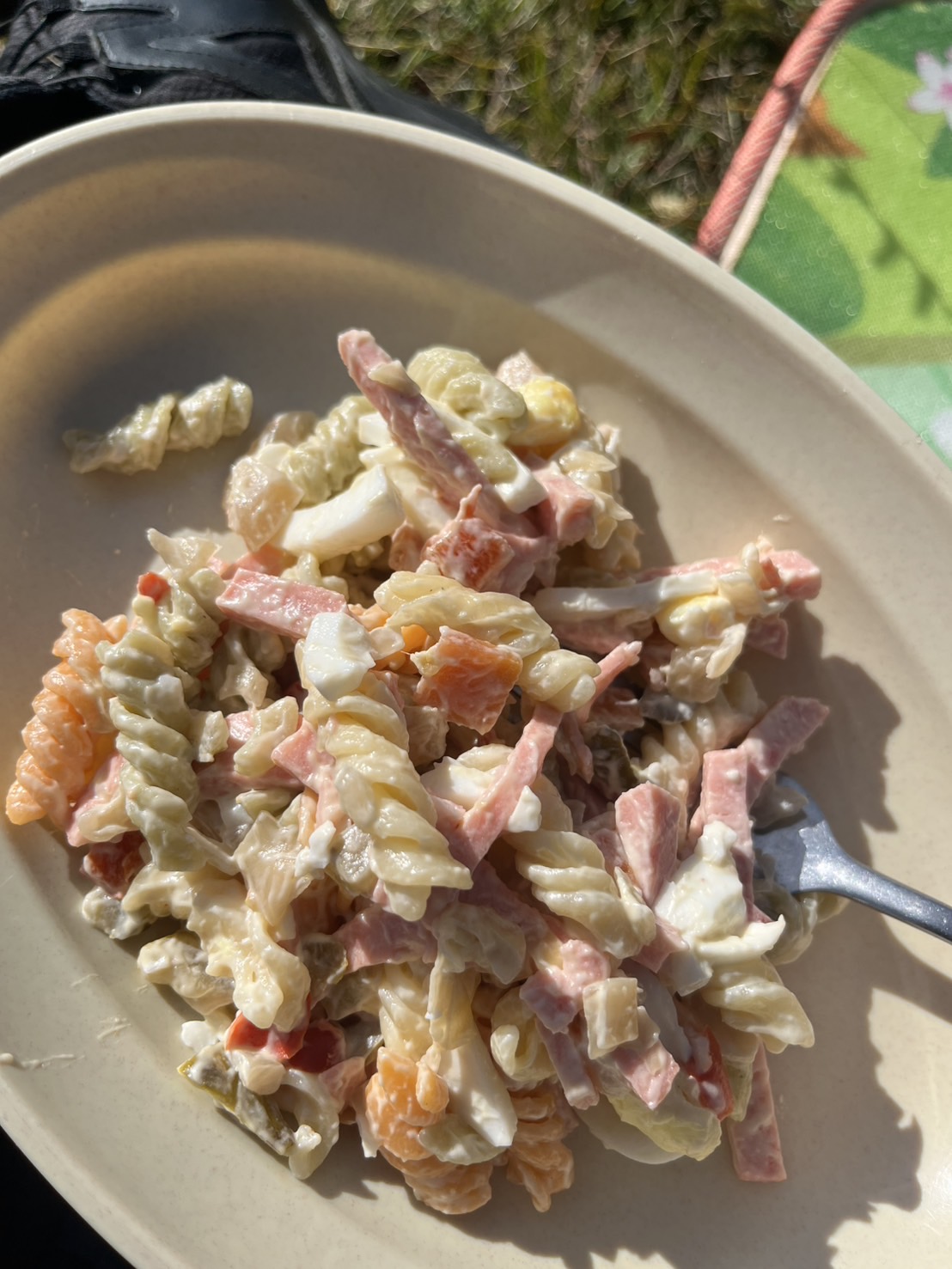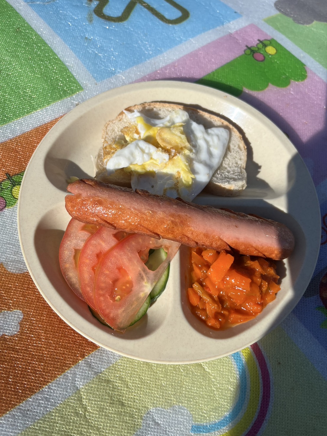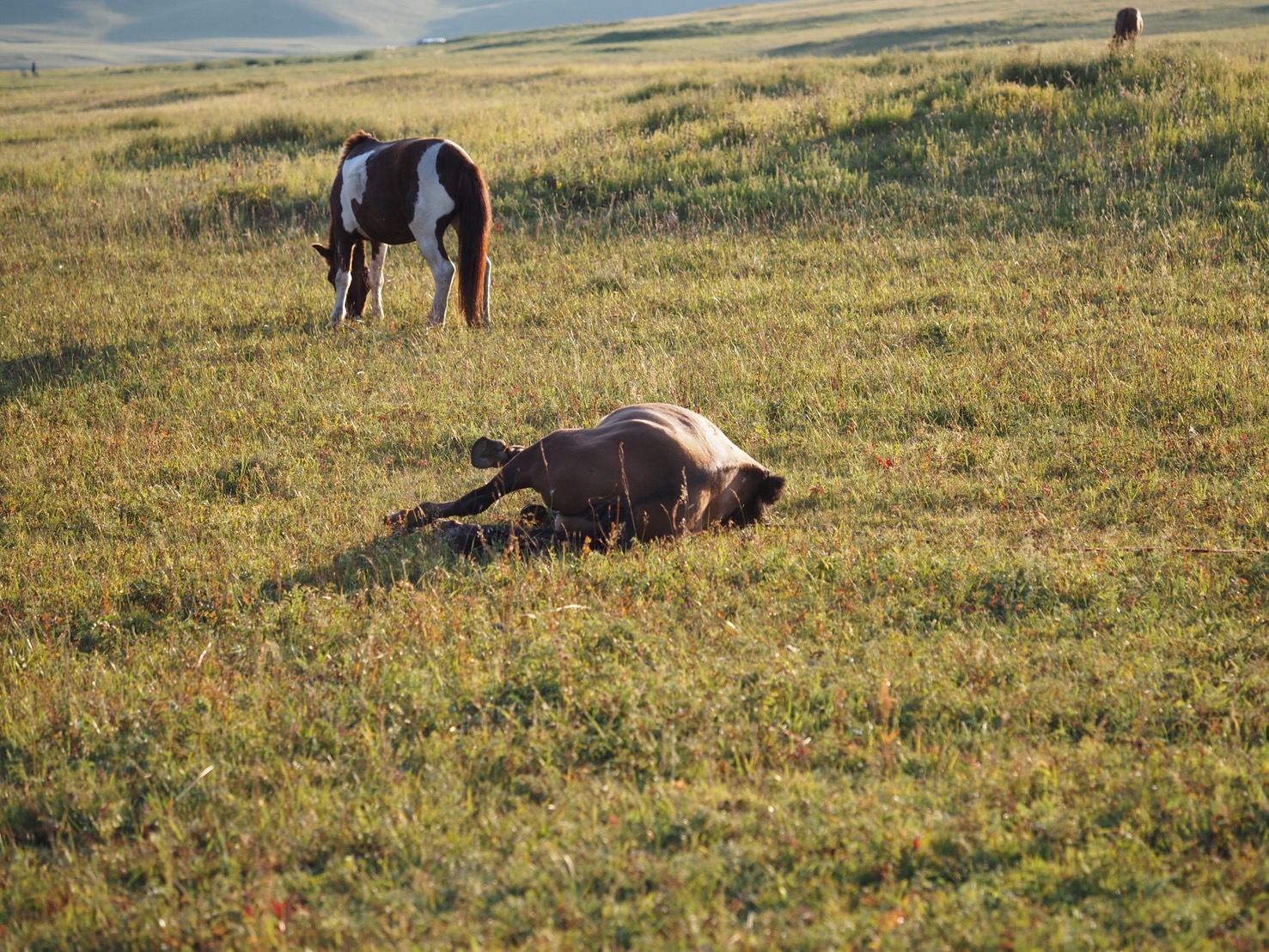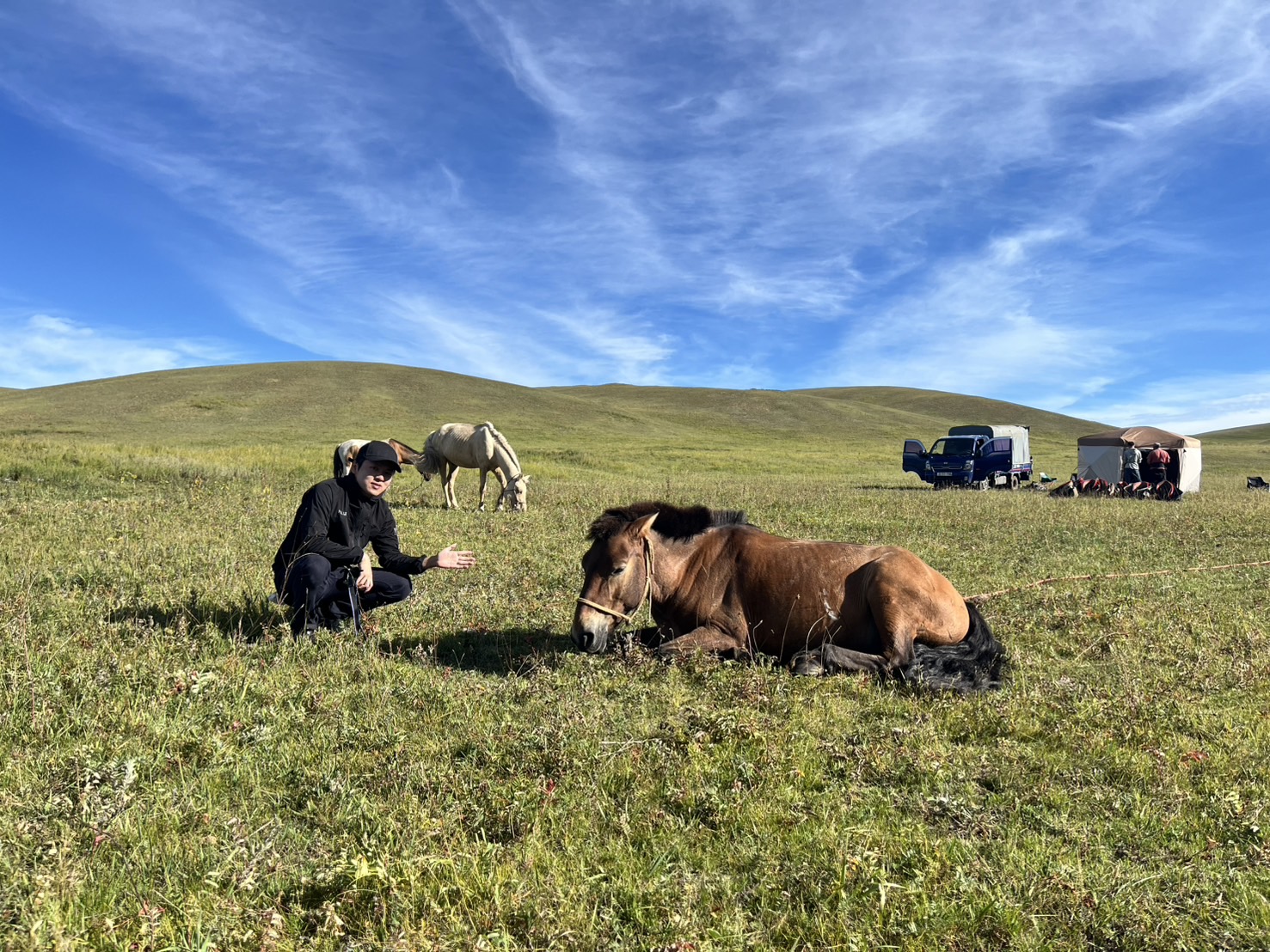 4日目、いよいよ乗馬ツアー最終日です。朝目覚めて外に出ると、馬たちが草原に横たわり、穏やかな表情で休んでいました。写真を撮りながら癒され、名残惜しさを感じます。朝食はマカロニサラダとパン。パンに練乳を塗ってみると、意外なほど美味しく、ちょっとした発見になりました。