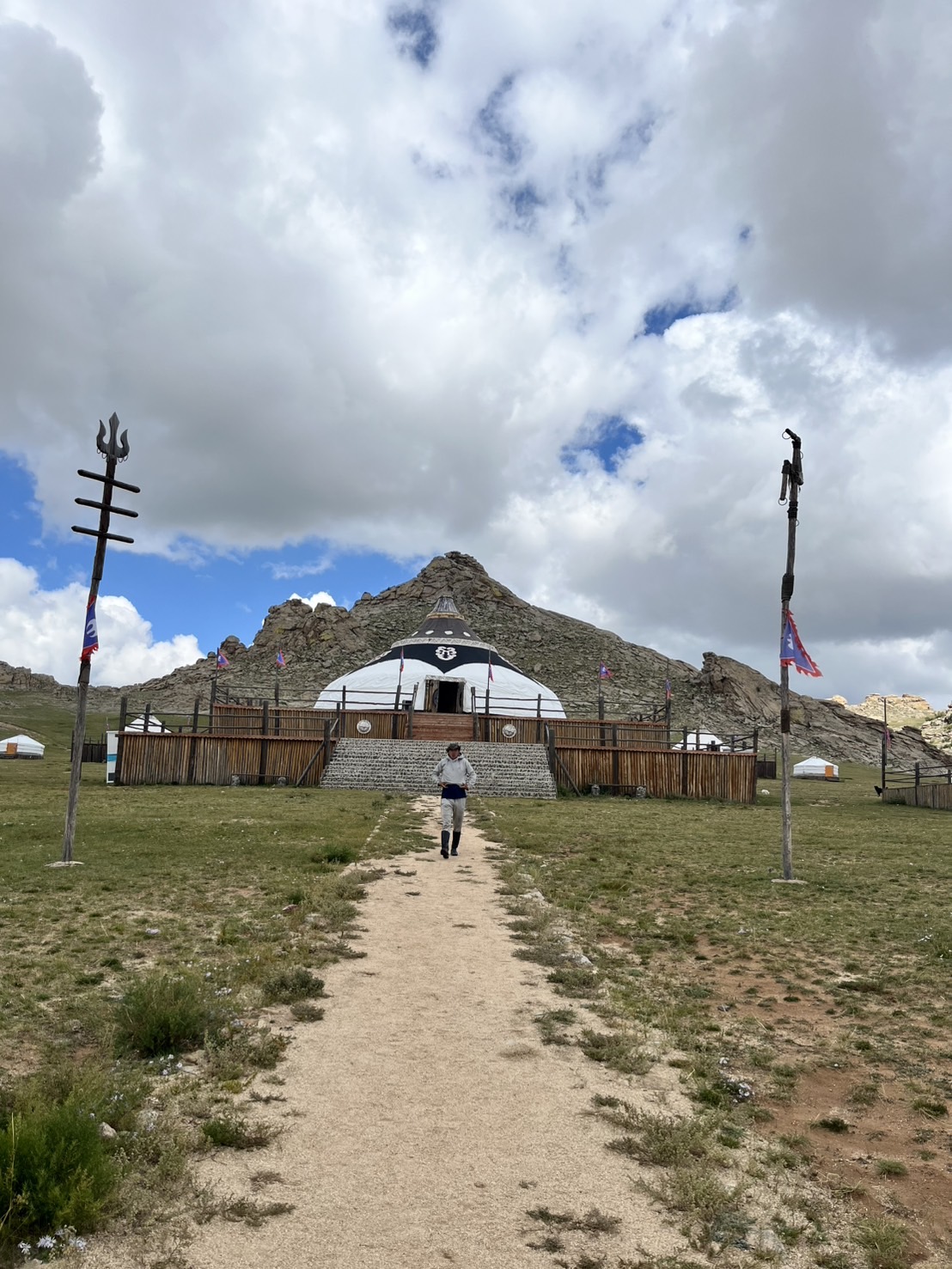 移動の途中では、人気ドラマ「VIVANT」の撮影地にも立ち寄ってくださり、思いがけないサービスに一同大喜び。車窓から眺めるモンゴルの景色は次第に広がりを見せ、揺られること約1時間半、目的地の「エルデネツーリストゲル」に到着しました。真夏の8月にもかかわらず外気はひんやりとしており、目の前に広がる果てしない草原と点在するゲルは、まさに思い描いていたモンゴルそのもの。旅の始まりにふさわしい光景でした。