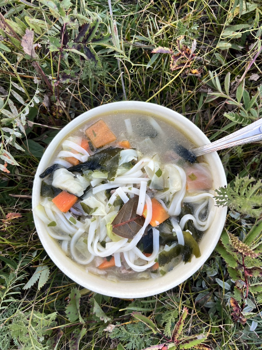 夕食は羊肉入りのわかめうどん風の麺料理。