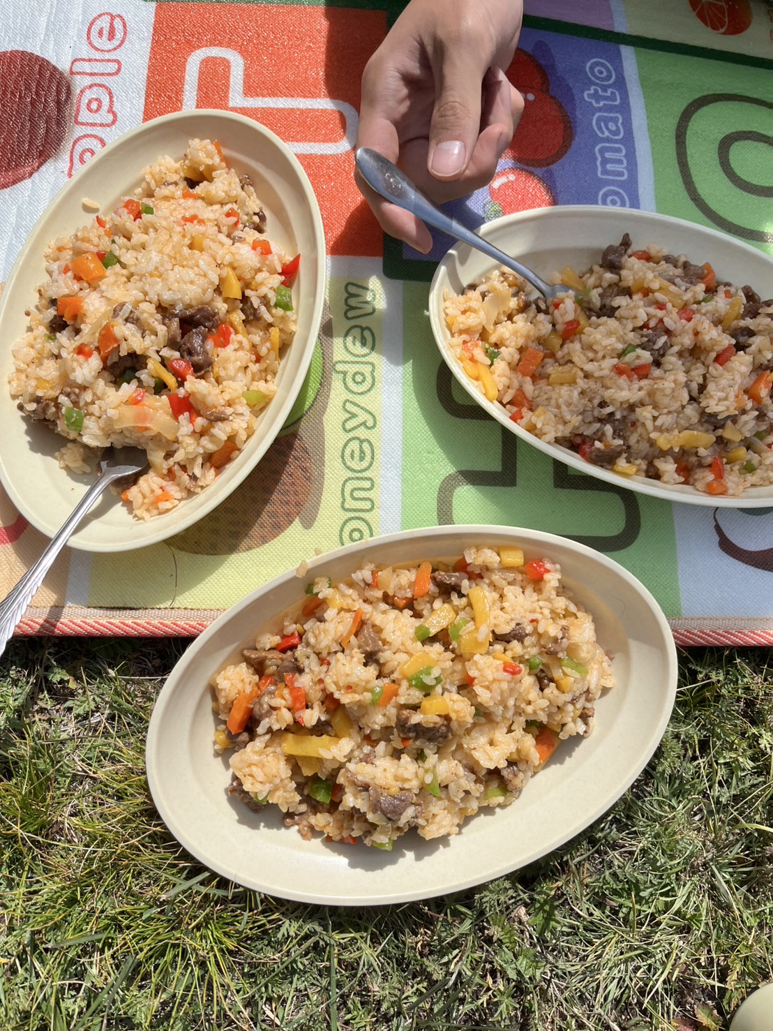 馬たちが給水する姿を横目に一休みし、私たちも昼食をとりました。本日のメニューは羊肉入りのピラフ。キャンプ中の食事には毎回羊肉が登場しましたが、どれも野菜とのバランスが良く、今日のピラフもとても美味しくいただけました。