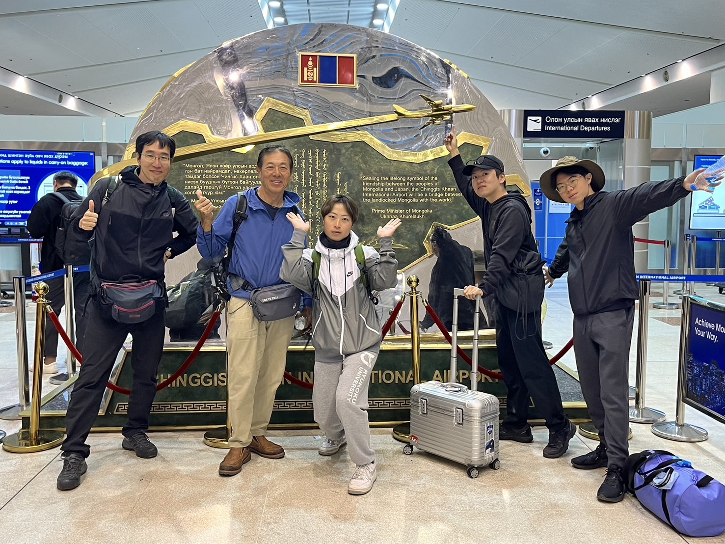 到着すると、いよいよお別れの時。冗談を言い合ったり、一緒に写真を撮って笑い合ったドブチュンとの別れは寂しく、ぜひまた再会したいと心から思いました。空港内では最後の思い出に、ゲルメンバー全員でオブジェの前で集合写真を撮影。