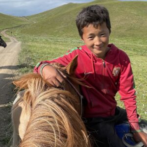 昼食後、ガイドのマンジーに「相撲がしたい!」とお願いすると、14歳のバットゥグス君が相手に。苦戦しつつも何とか勝利し、続いて挑んだマンジーにはあっさり投げ飛ばされてしまいました。遊び心あふれる時間を過ごした後は、午後の乗馬です。午前よりも駈歩の時間が増え、次第に馬との一体感を覚えながら、キャンプ地へと向かいます。