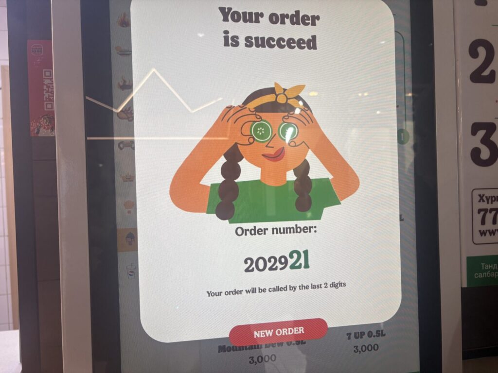 注文はセルフオーダー端末(タッチパネル)で行います。 言語も選べるので、モンゴル語ができなくても指先ひとつで注文完了!もちろんクレジットカード決済OKです。