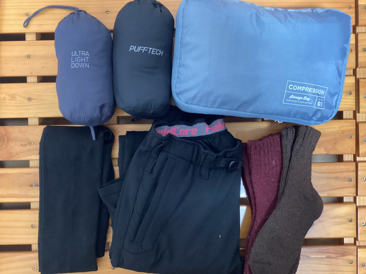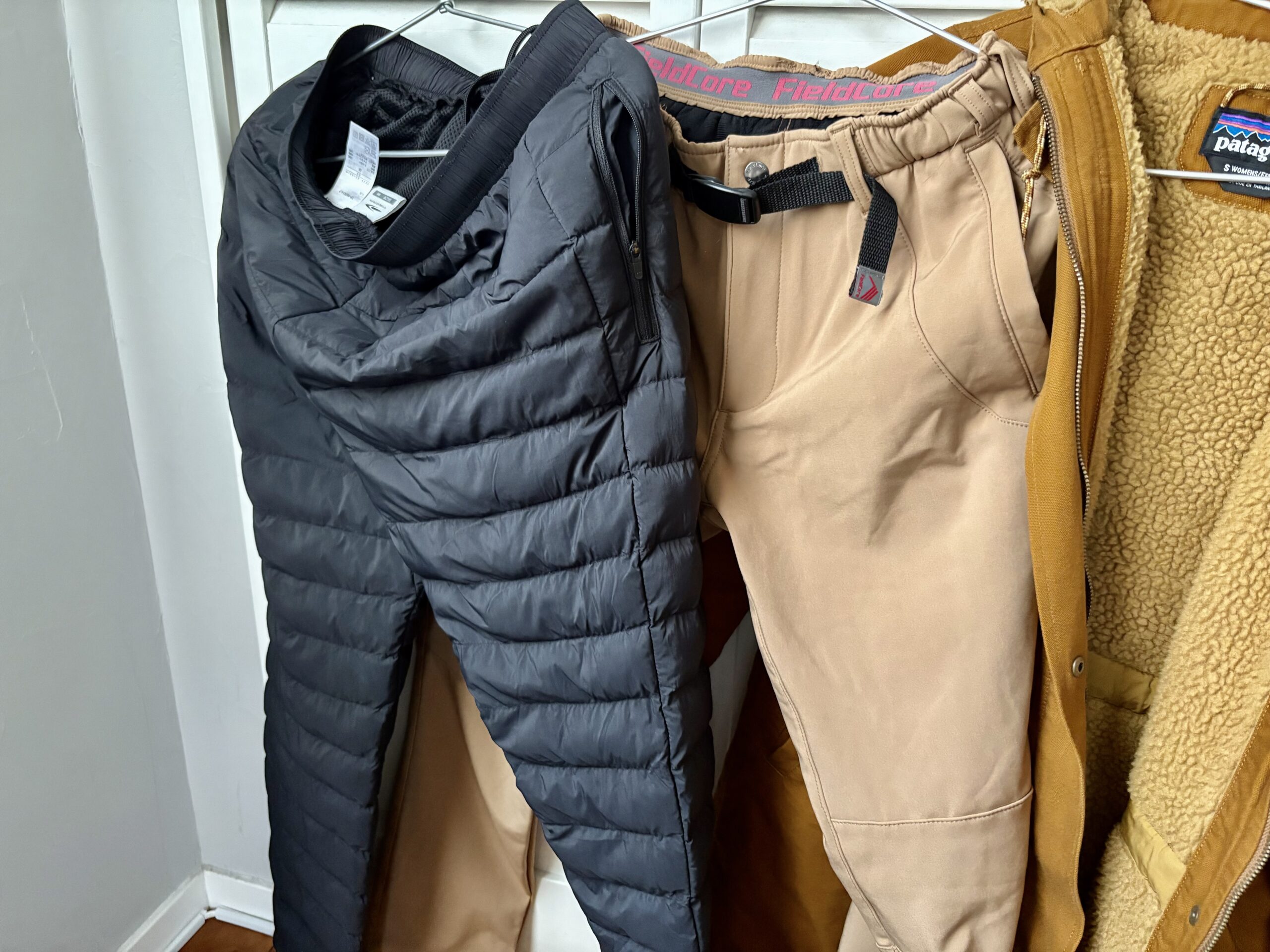 極暖ヒートテックレギンス+ワークマンの冬用登山ズボン+キャンプ用の中綿ダウンズボン。