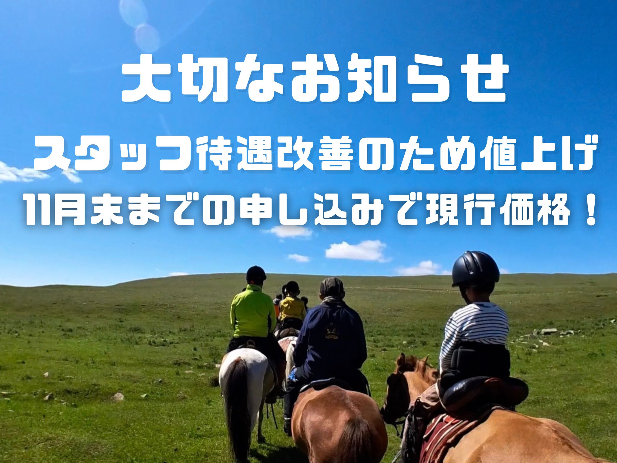 今回の価格改定は、私たちにとっても大きな決断でした。でもこれは、活躍してくれる遊牧民をはじめとしたスタッフに楽しんで仕事をしてもらうために必要なことであり、ひいてはお客様にとってもっと安心で、もっと感動的な旅を届けるために必要だと考えています。