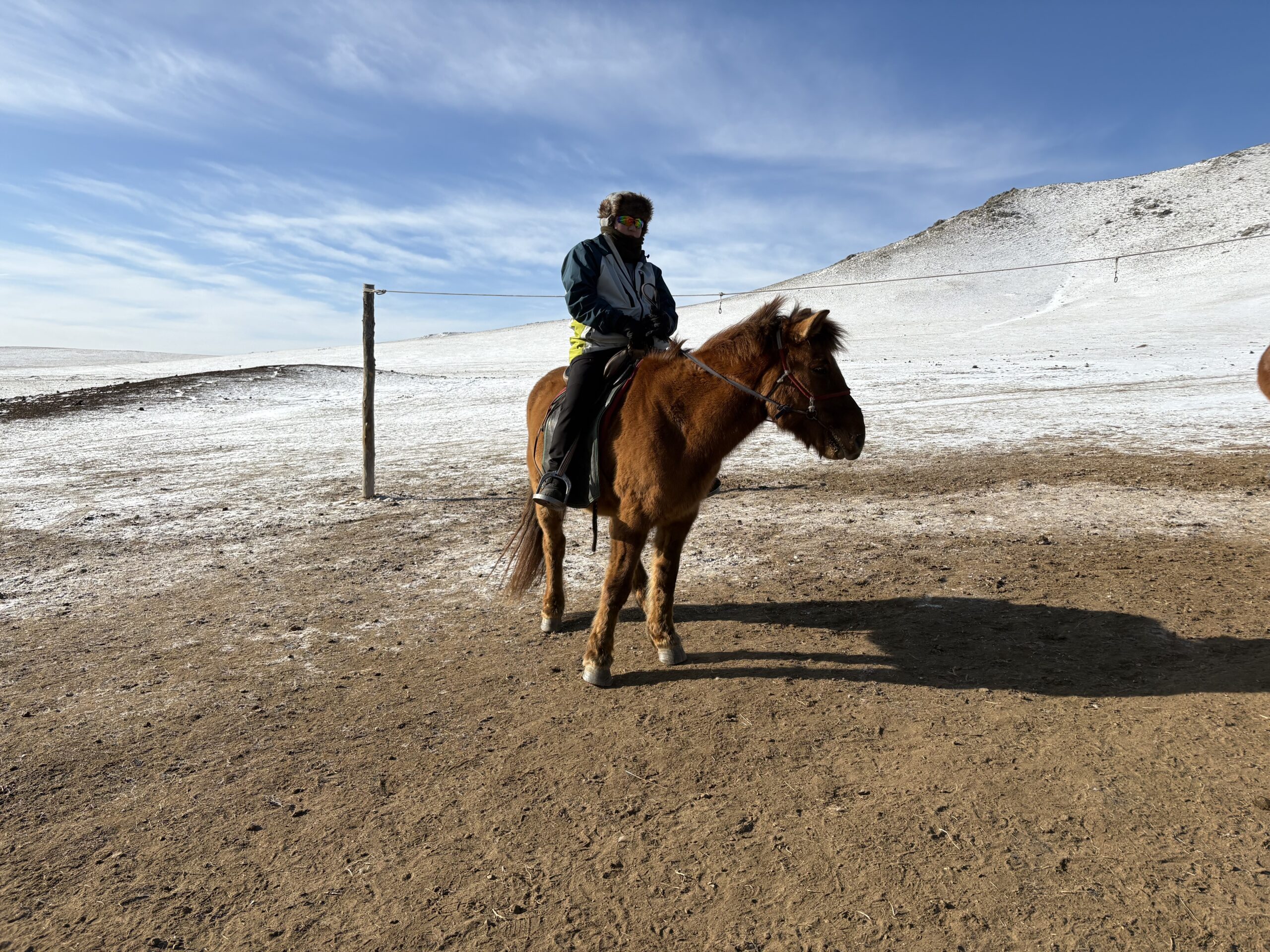 - 足元: 薄手の靴下、厚手の靴下を2重履きが基本。乗馬時は足用カイロを貼りましょう。靴は冬用のものが理想です。遊牧民宅では冬用のモンゴル靴を借りることも可能です。