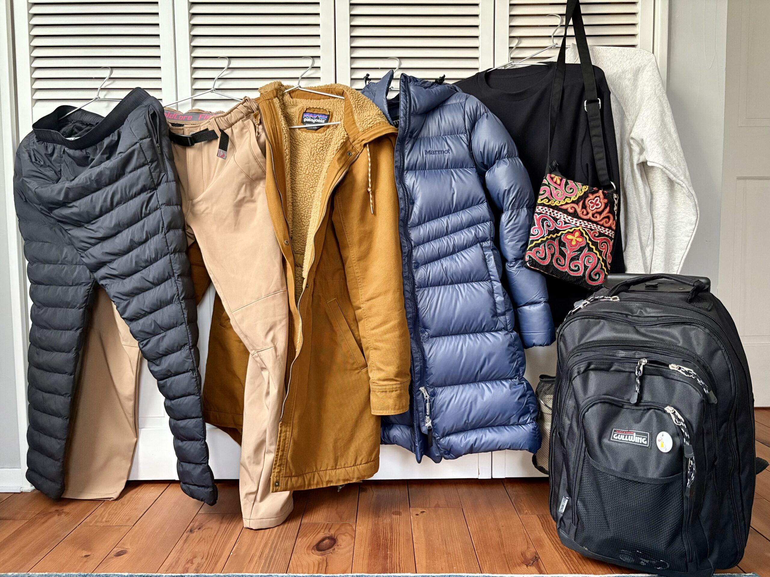 - 肌に近い方から順に:薄手の吸湿保温タイツ → 厚手の吸湿保温タイツ → ジャージ → 防風ズボン。