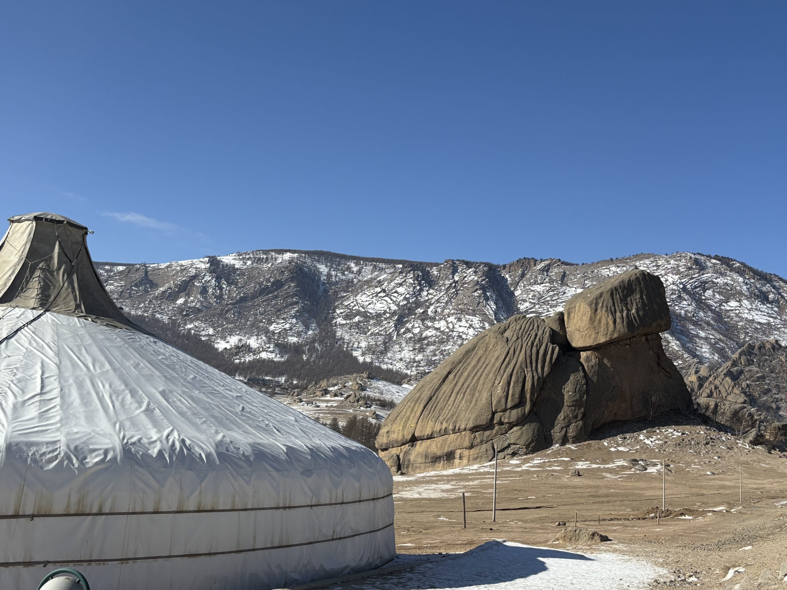 - 冬の魅力: 雪に覆われた山道を登り切った先にあるアリヤバル寺院は、まさに天空の寺。そこから見下ろす一面の雪景色は圧巻の絶景で、冬のモンゴルの静寂と雄大さを肌で感じらます。そして、有名な亀石の上から見る冬の景色は格別。また、亀石の前ではラクダに乗れる場所もあり、乗馬と違った景色を楽しめます。