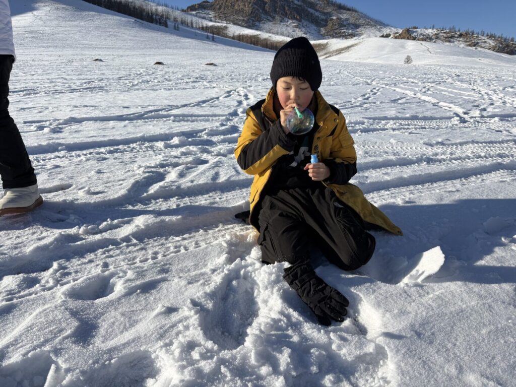 2回目に体験したときは、団体のサウナ体験お客様も一緒で、皆さんサウナの合間に極寒のモンゴルならではの次のような遊びを楽しまれていました。