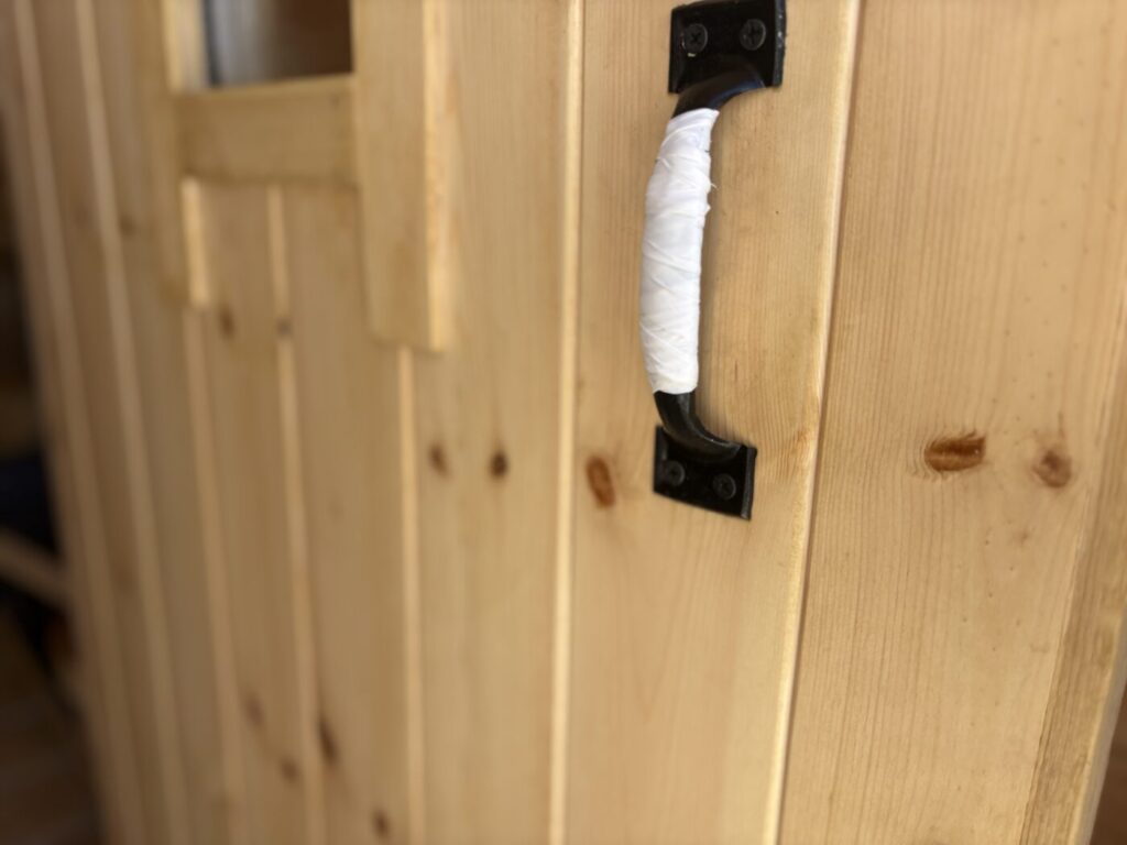 テント内は3〜4名がゆったり入れる広さです。 実は、購入したサウナのドアノブが金属製で、使用中に熱くなることが分かりました。そこで、お客様が火傷をしないよう、ドアにカバーを取り付けて安全に開閉できるように改良済みです!現地スタッフが事前にしっかりテストしているので、安心してお使いいただけます。