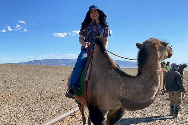 ラクダに乗ると想像以上に高さがありましたが、ゆったりとした動きで一度も暴れることもなかったので、安全に楽しむことができました。その後は、ゲルに戻り遊牧民の方にお礼の挨拶をしました。まだ歩けるようになったばかりの小さな子どもがハイタッチをしてくれて、最高に可愛かったです。また、番犬のようなワンちゃんは、吠えることもなく、ゲルの中に入らず、玄関で伏せをして待つなど、しつけがしっかりとされているお利口なワンちゃんでした。